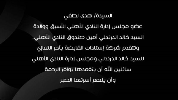 وأكدت الشركة في بيانها أنها تنعي السيدة هدى لطفي، والدة خالد الدرندلي، أمين صندوق الأهلي وقدمت التعازي للعائلة.