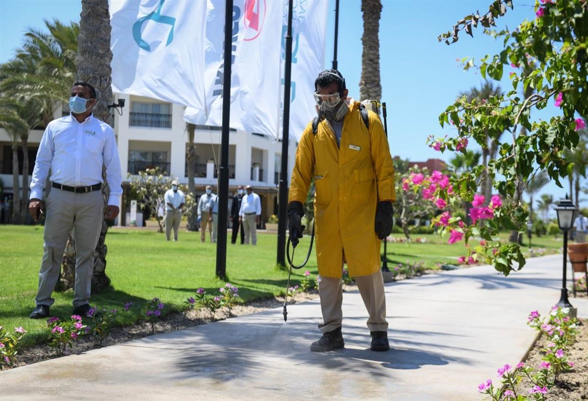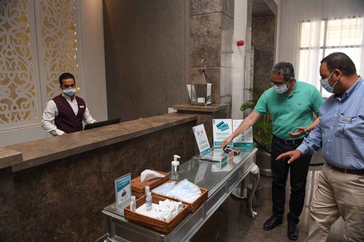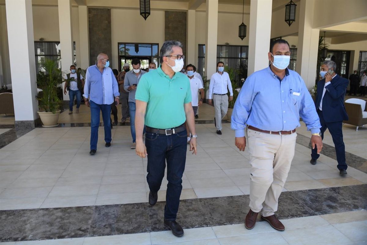 وخلال الجولة قام وزير السياحة والآثار بتفقد الإجراءات الوقائية التي تتبعها تلك الفنادق منذ دخول الضيف من باب الفندق وإجراءات تطهير الأمتعة وقياس درجات حرارة الضيوف وتطهير اليدين، ومنطقة الاستقبال والبهو وإجراءات التسكين ومنطقة المطاعم والمطابخ والبرجولات وحمامات السباحة، والممرات الداخلية والممشى الخارجي ومنطقة الشاطئ، للتاكد من الالتزام بضوابط السلامة الصحية والتباعد والتعقيم وغيرها.