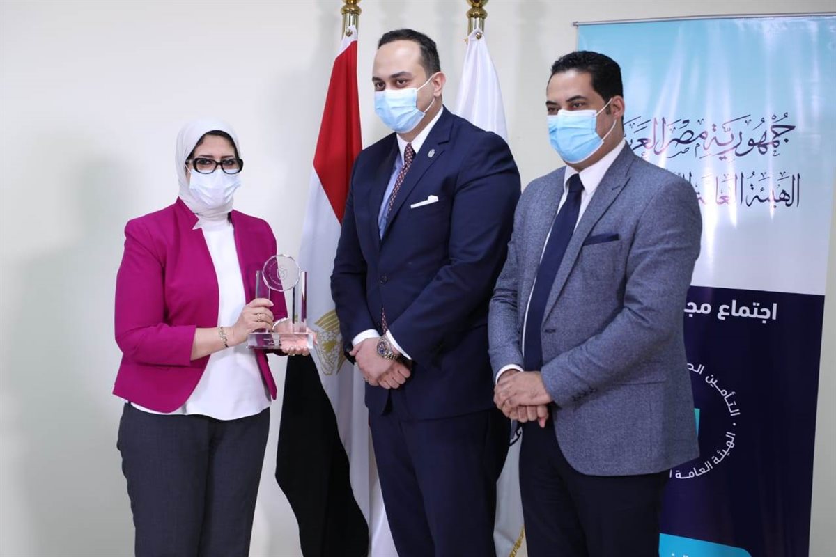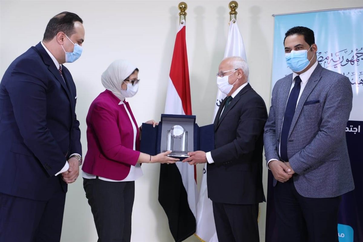 وسلم الدكتور أحمد السبكي رئيس الهيئة العامة للرعاية الصحية درع الهيئة، للدكتورة هالة زايد وزيرة الصحة والسكان، موجهًا الشكر إليها لدعمها الدائم لهيئة الرعاية الصحية الذي ساهم في استمرار المنظومة ونجاحها رغم كل التحديات، كما أهدت الوزيرة درع الهيئة للواء عادل الغضبان محافظ بورسعيد، لدوره الكبير في مساندة المنظومة بالمحافظة.