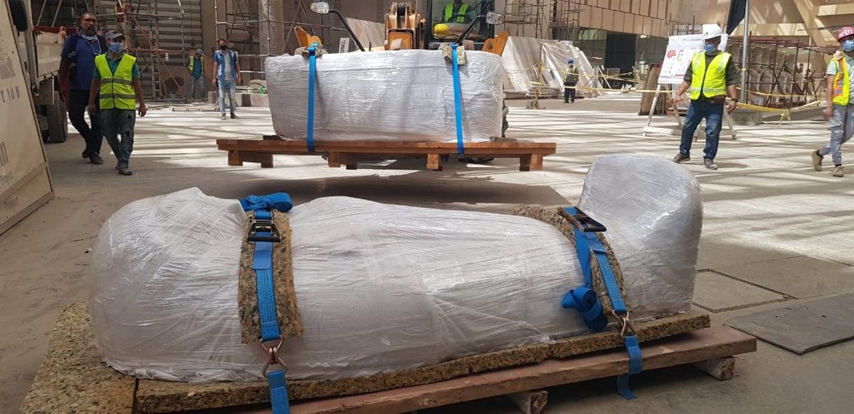 استقبل المتحف المصري الكبير بميدان الرماية ٧ قطع أثرية ضخمة قادمة من المتحف المصري بالتحرير تمهيدا لعرضها على الدرج العظيم ضمن سيناريو العرض المتحفي الخاص بالمتحف المقرر افتتاحه العام القادم.
