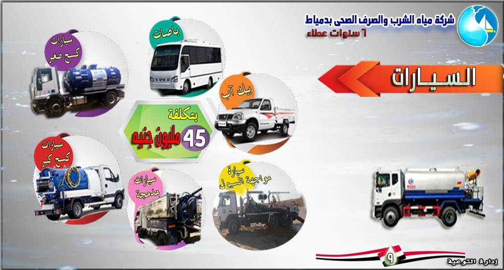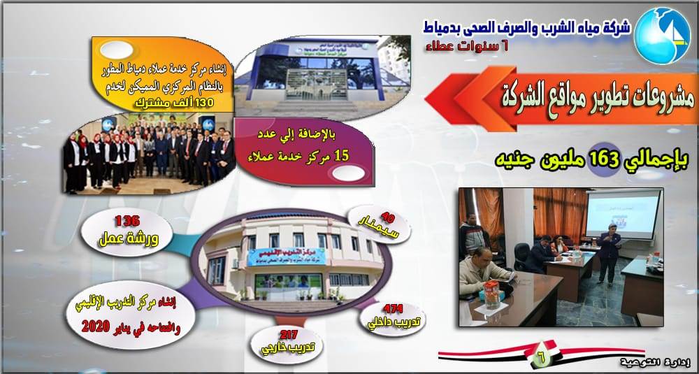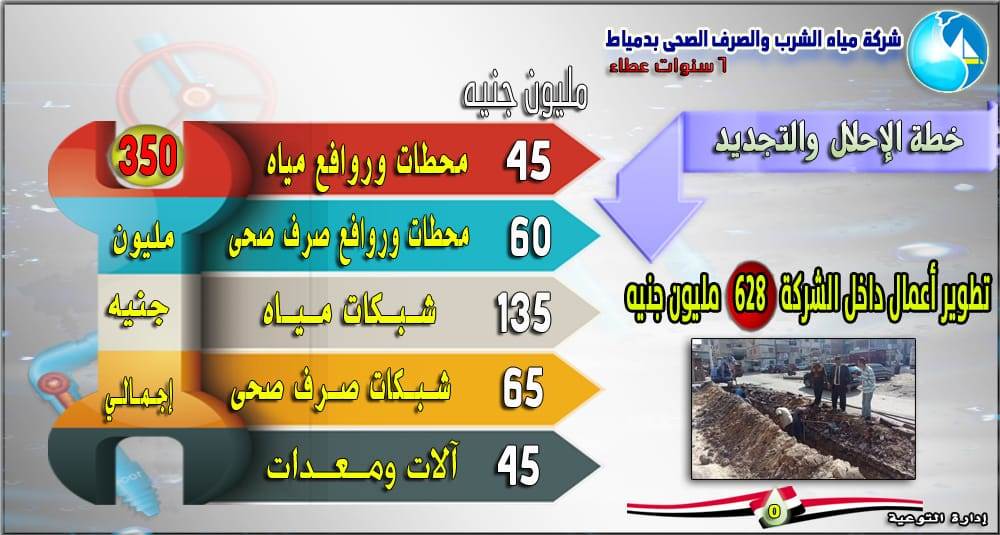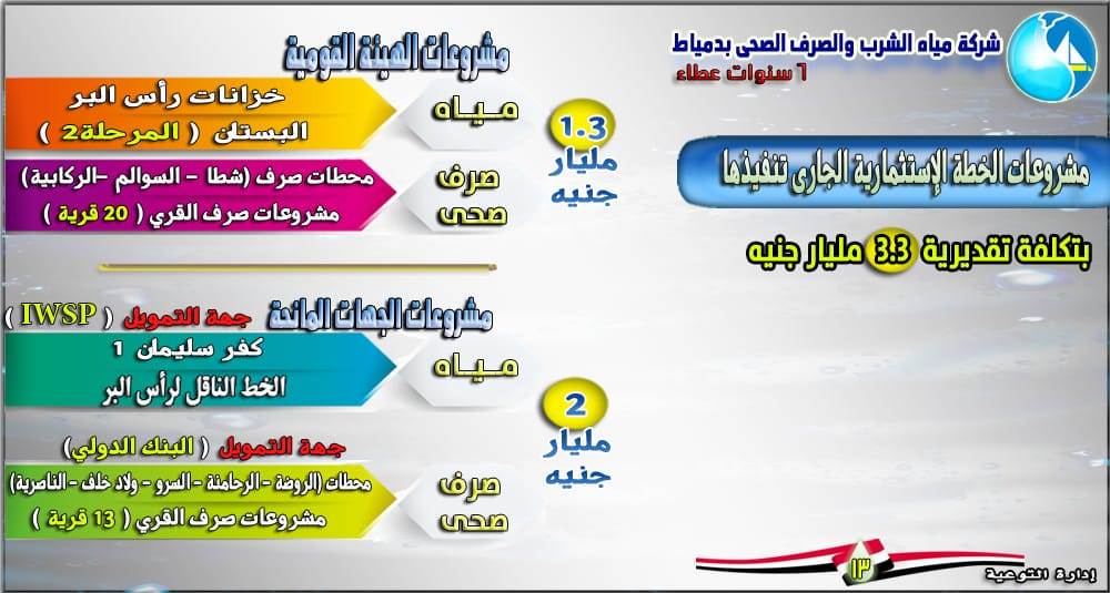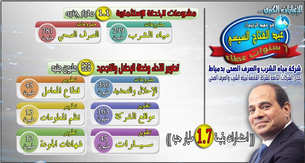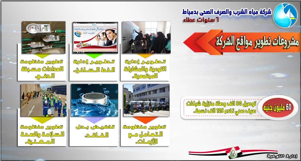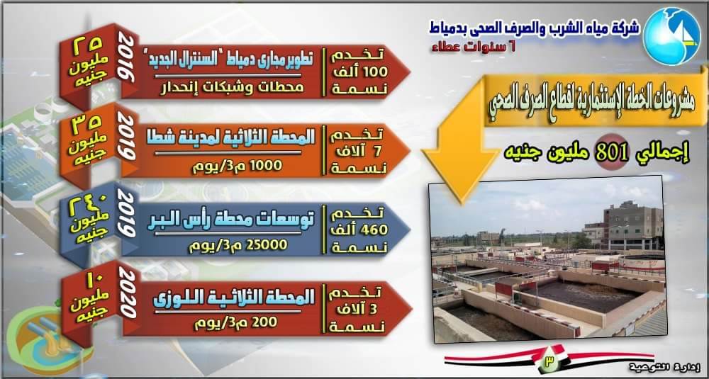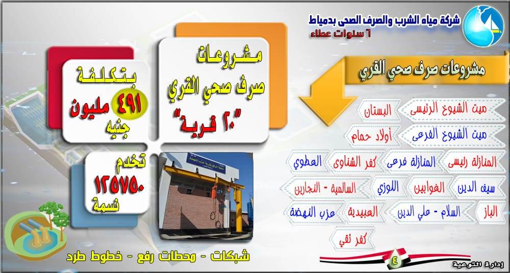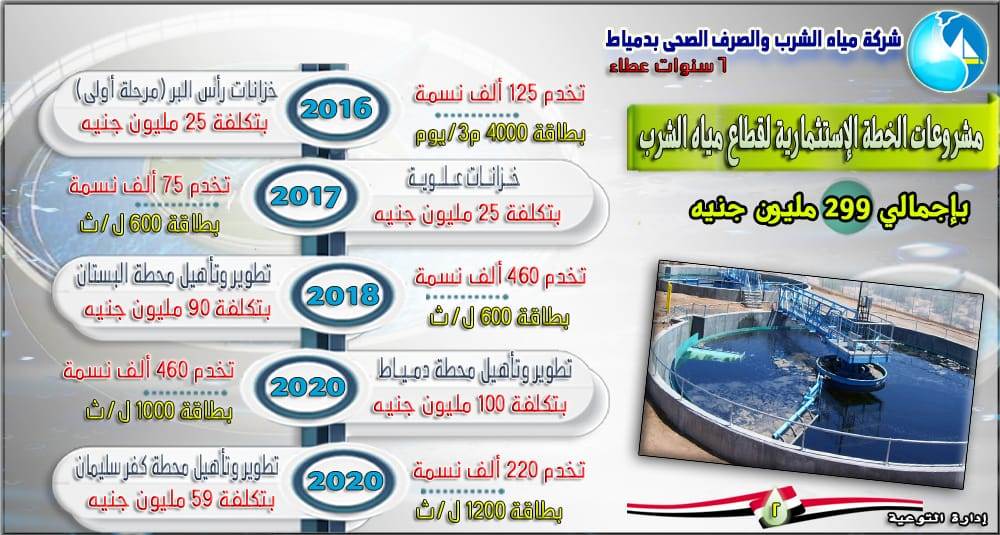وهذه المشروعات هي «مشروع خزانات رأس البر (مرحلة أولى)– مشروع خزانات علوية– تطوير وتأهيل محطة مياه البستان– تطوير وتأهيل محطة مياه دمياط– تطوير وتأهيل محطة مياه كفر سليمان»، كما تم تنفيذ 5 مشروعات في قطاع الصرف الصحي بقيمة 801 مليون جنيه، وهي مشروعات «تطوير مجاري دمياط (السنترال الجديد)- المحطة الثلاثية لمدينة شطا- توسعات محطة رأس البر- المحطة الثلاثية باللوزي»، بالإضافة لمشروعات صرف صحي القرى والتي تقدم خدمة الصرف الصحي لعدد ٢٠ قرية محرومة شملت شبكات ومحطات رفع وخطوط طرد.