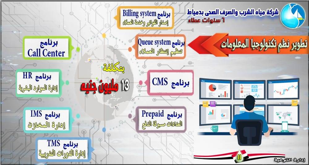 وأشار إلى أنه تم تزويد قطاعات الشركة المختلفة بعدد من البرامج الحديثة لتطوير نظم تكنولوجيا المعلومات بتكلفة ١٣ مليون جنيه، حيث حصلت الشركة على عدد من شهادات الاعتماد والجودة العالمية أهمها ٥ شهادات ISO في مجالات الجودة والبيئة والمعامل وسلامة الغذاء، وحصول ٦ محطات مياه و٩ محطات صرف صحي وشبكة ورافع صرف صحي على شهادة TSM.