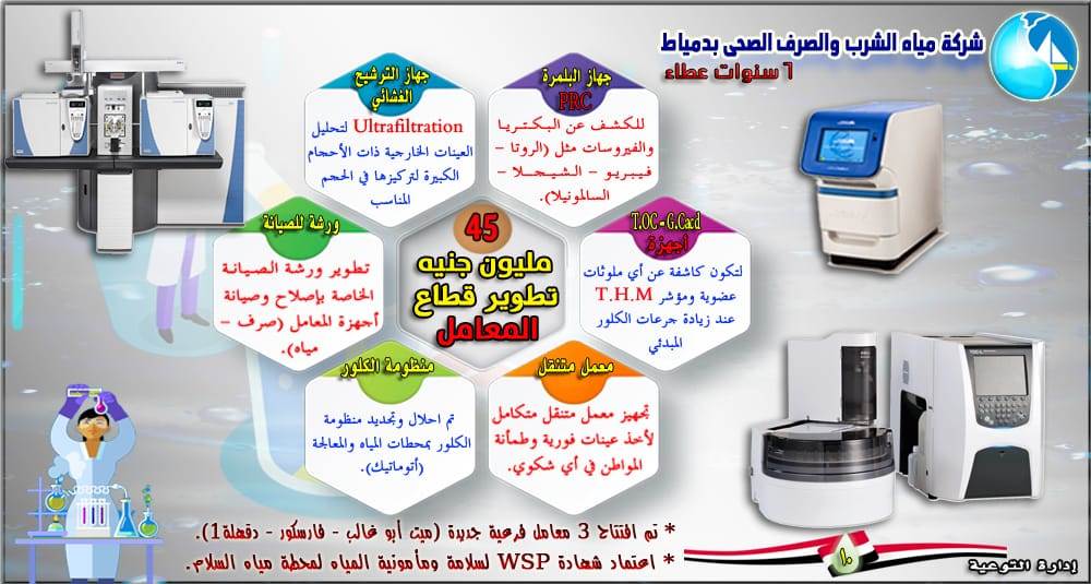وفي إطار حرص الشركة على جودة مياه الشرب وكفاءة معالجة الصرف الصحي، أوضح أنه تم تطوير وتأهيل قطاع المعامل باستثمارات بلغت نحو ٤٥ مليون جنيه، حيث تم تزويده بأحدث الأجهزة وتجهيز وحدة المعمل المتنقل وتطوير ورشة صيانة أجهزة المعامل، وتم افتتاح ٣ معامل فرعية جديدة هي (ميت أبو غالب- فارسكور- دقهلة ١) وكان نتاج ذلك حصول المعمل الرئيسي على اعتماد شهادة WSP لسلامة ومأمونية المياه لمحطة مياه السلام.