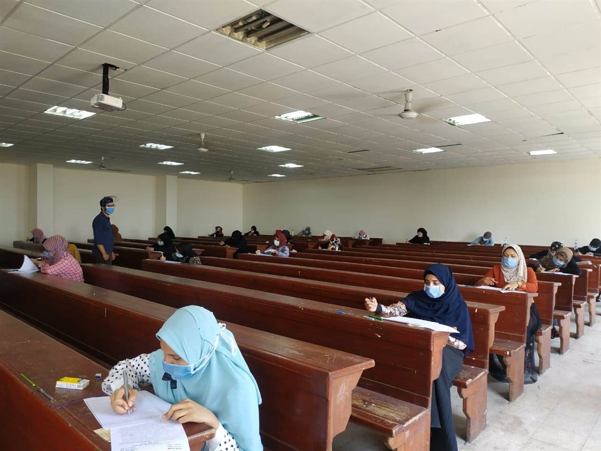 وقال الدكتور ممدوح المصري عميد الكلية: إن إدارة الكلية تقوم بجهد كبير لتذليل جميع العقبات التي قد تواجه الطلاب أثناء أداء الامتحانات، من خلال وضع لجان إدارية تنظيمة مدربة على أعلى مستوى لاستقبال الطلاب داخل الكلية بكل أمان ويسر وعمل خطة محكمة أثناء الدخول والخروج سواء قبل الامتحان أو حتى بعد الانتهاء منه، وتعقيم جميع المدرجات والقاعات التي تجرى بها الامتحانات بين فترات للجان الإمتحانات، وكذلك مشاركة زملائهم من طلبة اتحاد طلاب الكلية فى هذا الإجراءات الاحترازية والوقائية بتوجيه رسالة طمأنينة للطلاب أثناء أدائهم الامتحانات بالكلية، متمنيًا لهم التوفيق والنجاح.