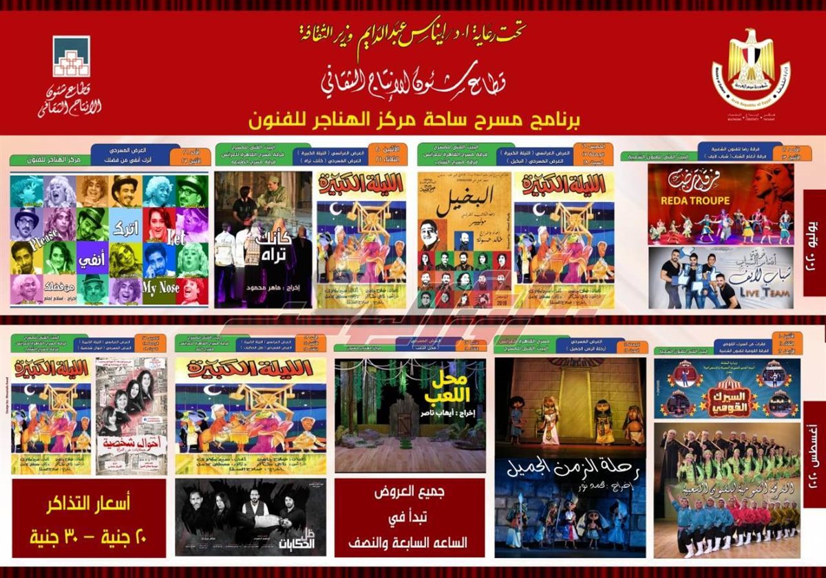 ويفتتح القطاع سهراته الصيفية، برائعة صلاح جاهين وسيد مكاوى أوبريت "الليلة الكبيرة"، يقدمه البيت الفنى للمسرح برئاسة المخرج إسماعيل مختار، يليه مسرحية "البخيل" إعداد وإخراج خالد حسونة، وعلى مدار شهر يوليو الجارى، يقدم البيت مسرحية "كأنك تراه" للمخرج ماهر محمود، مسرحية "اترك أنفى من فضلك" للمخرج إسلام إمام، بإشراف الفنان محمد دسوقى مدير مركز الهناجر للفنون.