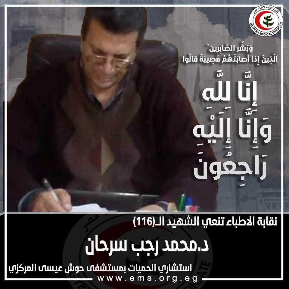 كما نعت النقابة الشهيد رقم 116، وهو الدكتور د. محمد رجب سرحان، استشاري الحميات بمستشفى حوش عيسى المركزي، والذي توفى متأثرا بالإصابة بكوفيد 19، في مستشفى عزل كفر الدوار.