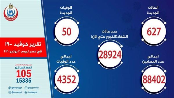 عاجل.. الصحة تسجل 627 حالة إيجابية جديدة لفيروس كورونا.. و50 وفاة