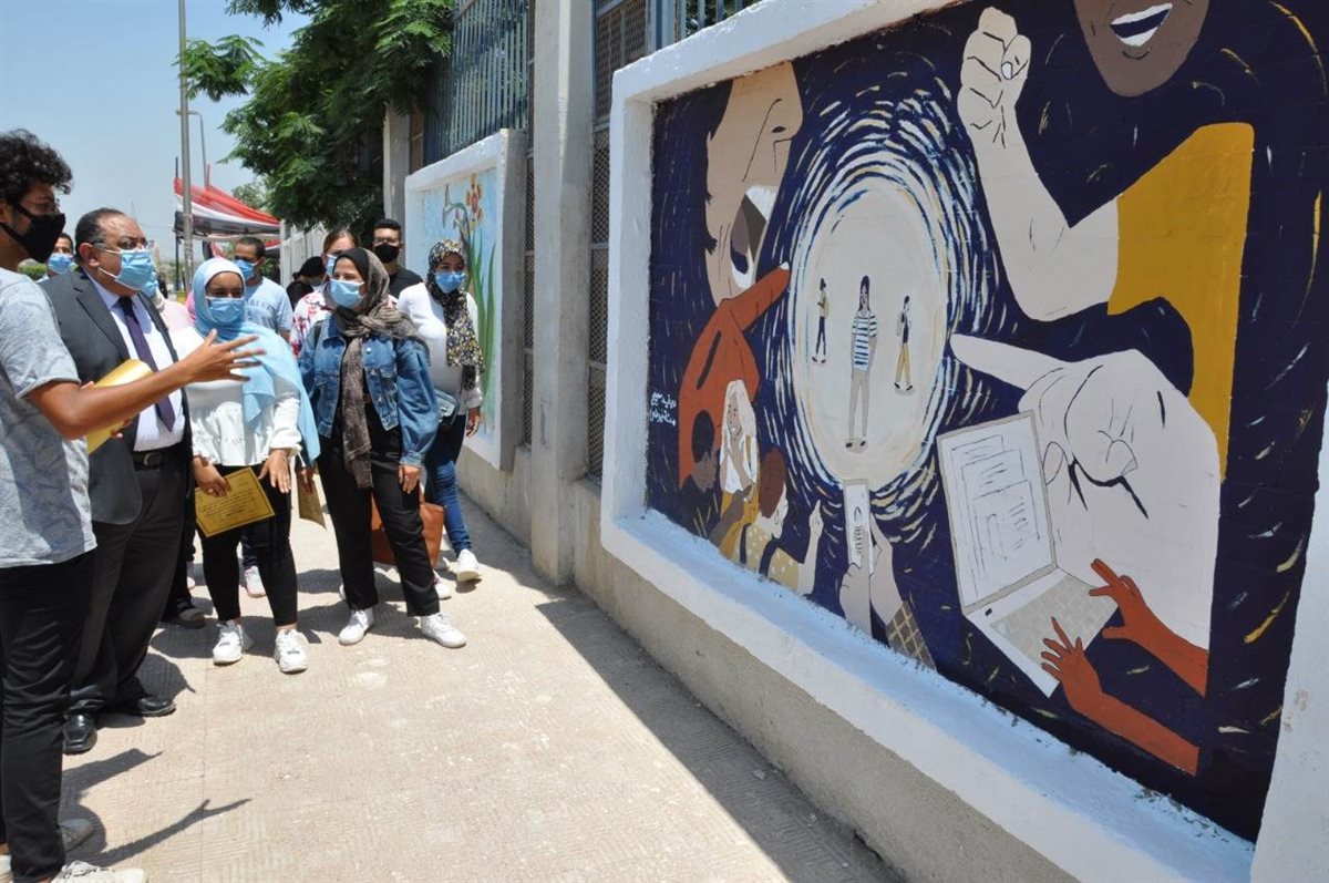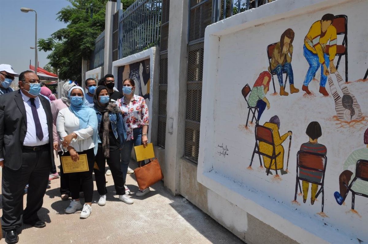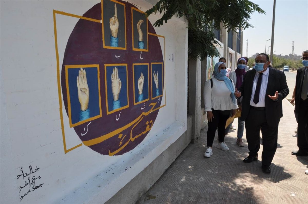 وأوضح الدكتور ماجد نجم، رئيس الجامعة، أن تنفيذ هذه اللوحات الفنية يؤكد دور الفن في نشر التوعية بالقضايا المجتمعية؛ لأن الفن مؤثر حقيقي يسهم في عمليات التجديد والتطوير الاجتماعي، وأشاد بالمستوى الفني للوحات، وبالجهد المبذول من الطلاب لإخراج هذا العمل الفني الرائع، الذي يهدف إلى رفع الذوق الفني لطلاب الجامعة, وكذا نشر ثقافة جديدة بالتنوع في وسائل التوعية ولغات تواصلها لتصل الرسالة إلى جميع الفئات المستهدفة. وقد قام طلاب كلية التربية الفنية بالقيام بتنفيذ عدد ٧ لوحات فنية على سور الجامعة، عبرت اللوحة الأولى عن البيئة وبينت أن البيئة السليمة قادرة على تنشئة إنسان سليم، وعبرت اللوحة الثانية عن الوحدة "كلنا يد واحدة"، لتشير إلى أهمية الاتحاد وقوة العمل الجماعي للأفراد وحمايتهم من أي خطر، بينما عبرت اللوحة الثالثة عن العقل وتأثره بالخير ونقيضه، وجاءت اللوحة الرابعة معبِّرة عن لغة الإشارة "حب نفسك"، واللوحة الخامسة لأم تحتضن ابنها، والسادسة عن الضغوط التي تواجه الإنسان, التي تتمثل في العمل والسوشيال ميديا, وتشير اللوحة السابعة إلى قدرة الجماعة على إنقاذ الإنسان فاقد الأمل ودفعه إلى التفاؤل والعمل.