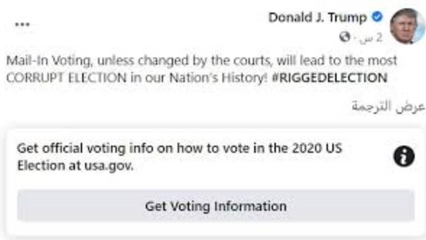 وضع موقع "فيسبوك" للتواصل الاجتماعي اليوم الثلاثاء ملحوظة عن "معلومات عن الاقتراع" ملحقة بمنشور للرئيس الأمريكي دونالد ترامب عن التصويت عبر البريد.