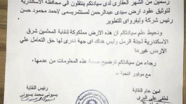 حيث أكد بسيوني في شكوى النقابة على "س. ر. م" رئيس مجلس ادارة "جمعية معلمي شرق إسكندرية لتطوير منطقة سيدي عبد الرحمن" قد دأب على إصدار عقود بيع لقطع أرض مملوكة للجنة الرمل النقابية للعاملين والتي تم تخصيصها للأعضاء من المعلمين وأسرهم والتي تشترط النقابة عدم التنازل عنها للغير حيث انه مشروع قرية سياحية متكاملة طبقا للأوراق الرسمية الصادرة من محافظة مطروح التي تتبعها الأرض جغرافيا وكان يدعي مشتركا مع أخرى استدعاء موظفي الشهر العقاري لتسجيل عقود أصحاب الأراضي داخل الجمعية وعند فحص النقابة للأمر من خلال مخاطبات مع الشهر العقاري لمحافظة مرسي مطرح أفادوا بأنه لا يجوز انتقال موظفي الشهر العقاري من محافظة لمحافظة أخرى.