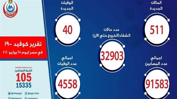 وأوضح الدكتور خالد مجاهد مستشار وزيرة الصحة والسكان لشؤون الإعلام والمتحدث الرسمي للوزارة، أنه تم تسجيل 511 حالة جديدة ثبتت إيجابية تحاليلها معمليًا للفيروس، وذلك ضمن إجراءات الترصد والتقصي والفحوصات اللازمة التي تُجريها الوزارة وفقًا لإرشادات منظمة الصحة العالمية، لافتًا إلى وفاة 40 حالة جديدة.