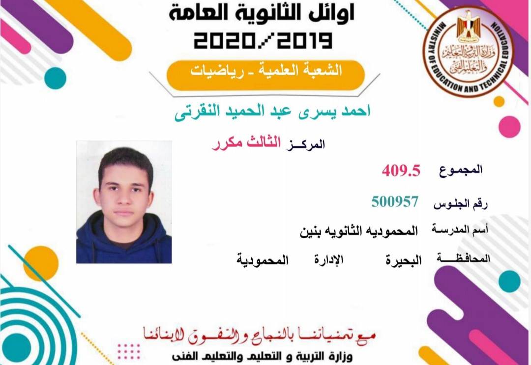 وهنأ المحافظ، كلا من الطالب صلاح الدين صبحى موسى كامل ابن قرية امليط بايتاى البارود ، من مدرسة عزت النمر الثانوية بنين ، الاول مكرر على مستوى الجمهورية بمجموع 410 علمي علوم والطالب احمد يسرى عبد الحميد النقرتى ابن قرية سرنباى بالمحمودية ، من مدرسة المحمودية الثانوية بنين، الثالث مكرر على مستوى الجمهورية بمجموع 409.5 علمي رياضة.