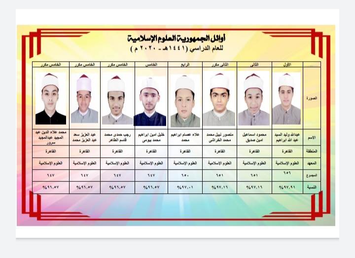 *العلوم الإسلامية:* الأول: عبدالله وليد السيد عبدالله إبراهيم، القاهرة، معهد العلوم الإسلامية – القاهرة، ٩٧,٩١٪.