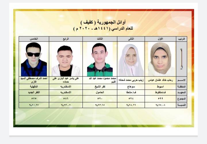 *كفيف:* الأول: رحاب خالد عثمان عباس، الأول، أسيوط، فتيات منفلوط، ٩٥,٠٨٪.