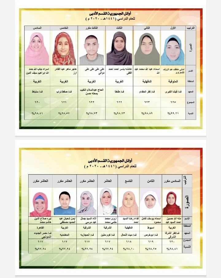 الثاني: أسماء عبدالله محمد عبدالله، الدقهلية، فتيات كفر المقدام، ٩٨,٨٩٪.