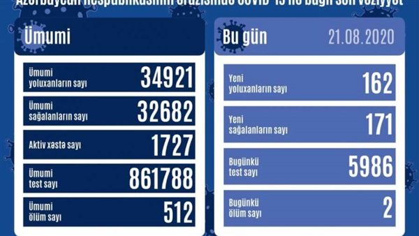 أصيب 162 شخصا بعدوى فيروس كورونا المستجد كوفيد 19 في أذربيجان، خلال يوم.