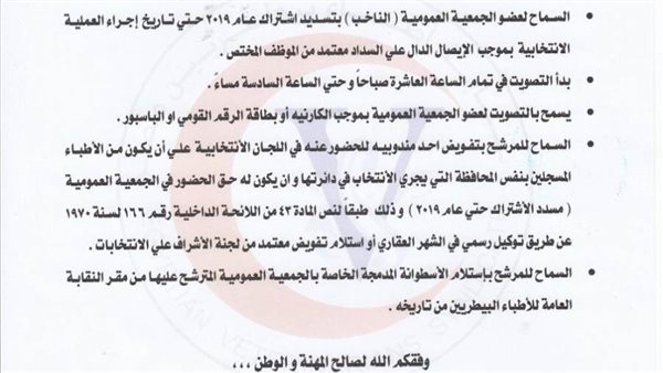 2- السماح لعضو الجمعية العمومية “الناخب” بتسديد اشتراك عام 2019 حتي تاريخ إجراء العملية الانتخابية، بموجب الإيصال الدال علي السداد معتمد من الموظف المختص.