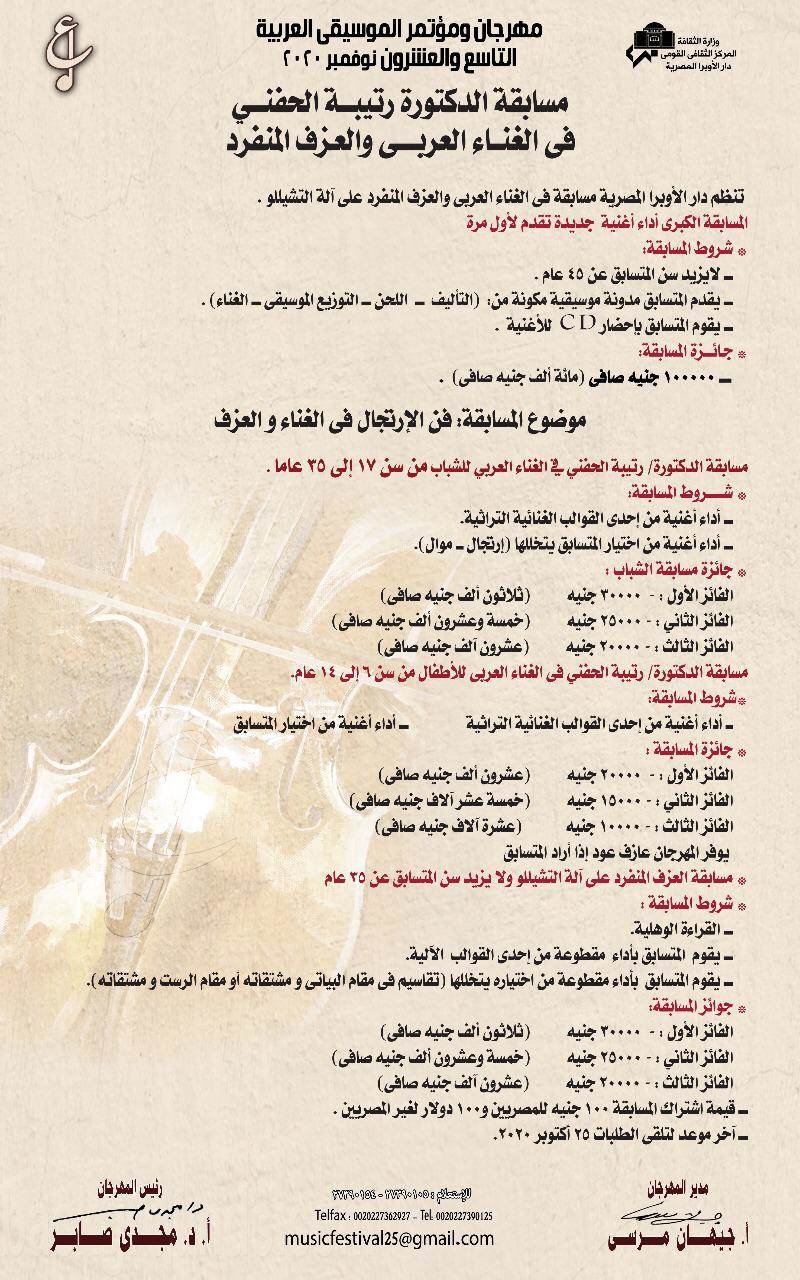 أعلنت دار الأوبرا المصرية، برئاسة الدكتور مجدي صابر، تفاصيل وشروط مسابقة الدكتورة رتيبة الحفني في الغناء والعزف المصاحبة لفعاليات الدورة 29 من مهرجان ومؤتمر الموسيقى العربية، والمقام فى الفترة من 1 حتى 7 نوفمبر المقبل.