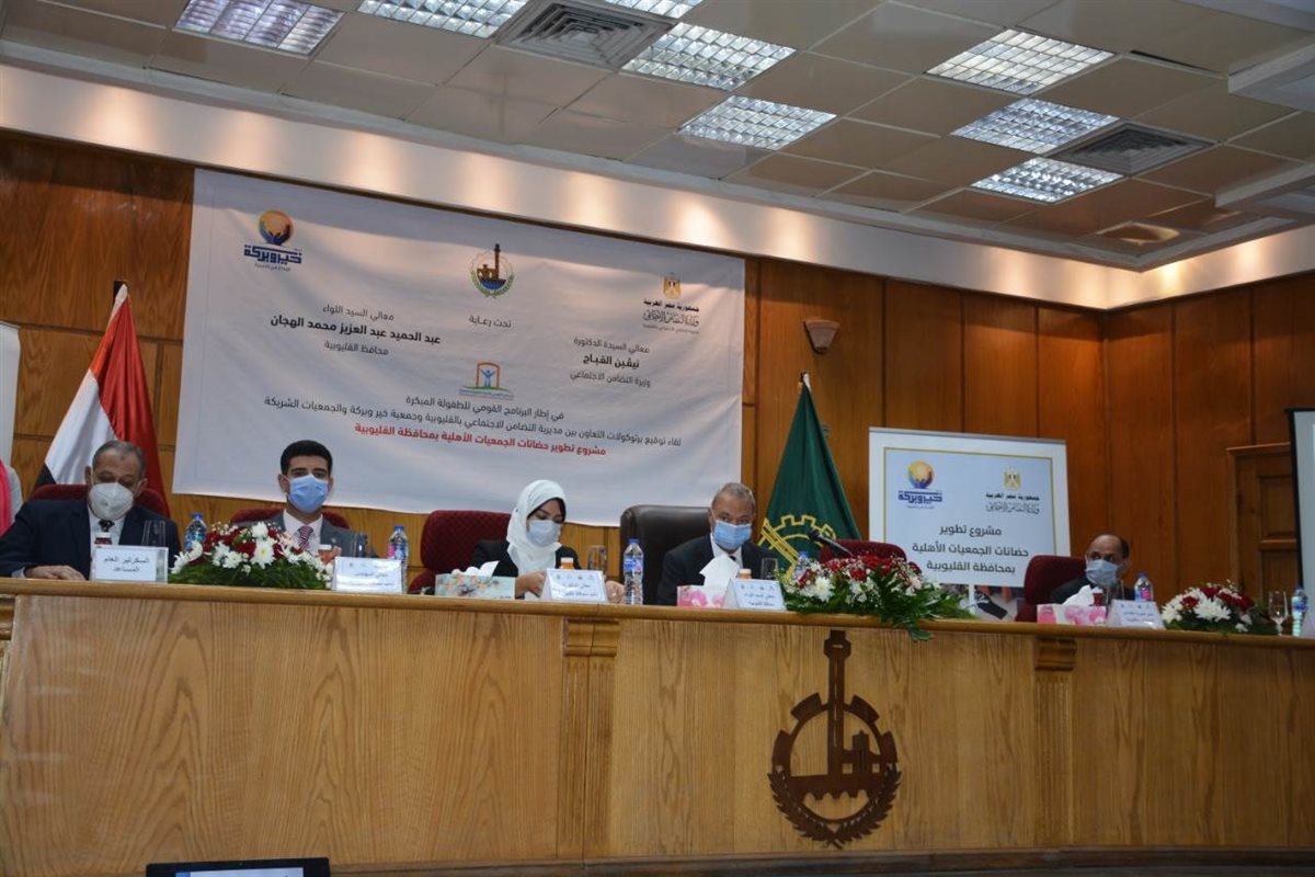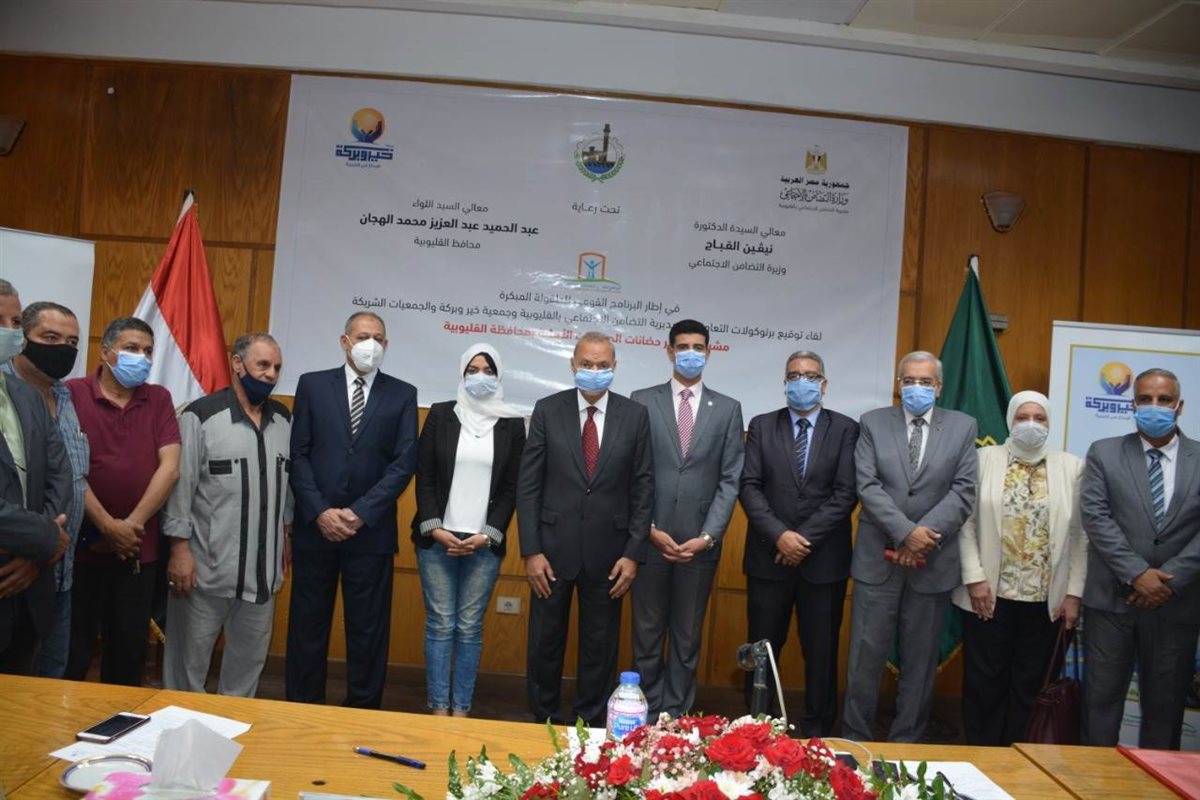 وقعت مديرية التضامن الاجتماعي اليوم بروتوكول تعاون مع جمعية خير وبركة لتطوير عدد 22 حضانة بعدد 16 جمعية بتكلفة تصل إلى 2 مليون و 108 آلاف جنيه كمرحلة أولى لمشروع التطوير، تحت رعاية نيفين القباج وزيرة التضامن الاجتماعى واللواء عبد الحميد الهجان محافظ القليوبية.