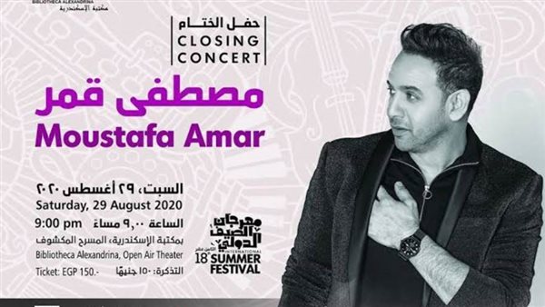 يشهد الختام تقديم حفلًا غنائيًا للنجم مصطفى قمر، وذلك في تمام التاسعة مساء على المسرح المكشوف بالمكتبة.