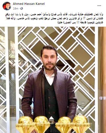 نشر عميد الكرة المصرية على حسابه الرسمي على موقع التواصل الاجتماعي "فيس بوك" ساخرًا من الأمر قائلًا: “وأنا كمان هحكيلكم حكاية شربات.. قالك كأس ضاع واسألوا أحمد حسن.. دول ٤ يا بابا انت وهو علشان لو ناسيين؟! ولو عاوزين واحد كمان ممكن نرجع نلعب ونجيب كأس خامس.. والله فعلاً عايشين كوميديا هابطة! بس الصورة حلوة”.