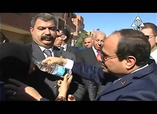 وأهدى الطفل للسيسي مصحفًا كهدية تذكارية، وتحدث إليه عن مشاكل قريته التي يعاني معظم القاطنين بها من الفشل الكلوي وسرطان الدم بسبب تلوث المياه وري الأراضي الزراعية بمياه الصرف الصحي.