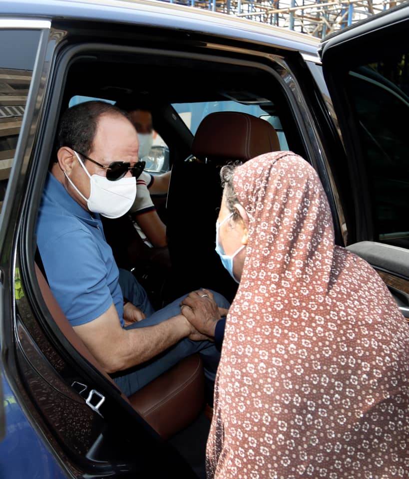 بينما كان الرئيس يتفقد أمس بعض المواقع الإنشائية بمشروعات الطرق والمحاور والكبارى في مناطق جسر السويس ومصر الجديدة ومدينة نصر، التقى مع سيدة مسنة، واستمع لطلبها ووجهً برعايتها الفورية صحيًا.