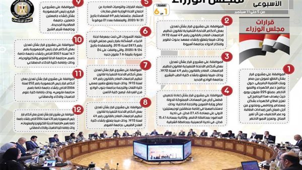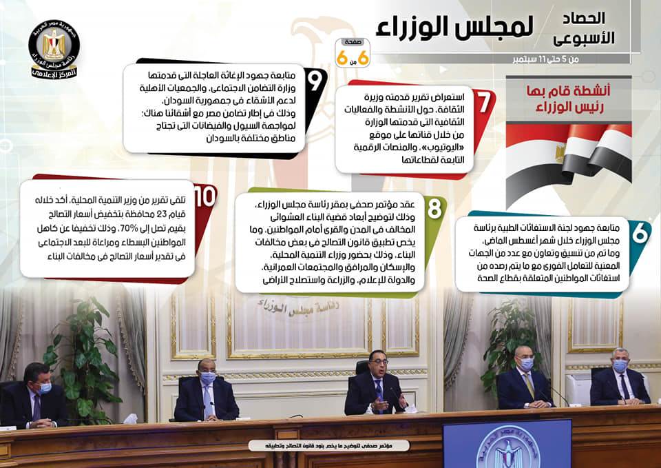 نشر المركز الإعلامي لمجلس الوزراء، تقريراً شمل إنفوجرافات سلط من خلالها الضوء على الحصاد الأسبوعي لمجلس الوزراء، وذلك خلال الفترة من 5 حتى 11 سبتمبر 2020، والذي تضمن الموافقة على عدد من القرارات، فضلاً عن الاجتماعات واللقاءات التي عقدها الدكتور مصطفى مدبولي، رئيس مجلس الوزراء، بالإضافة إلى ما قام به من أنشطة.