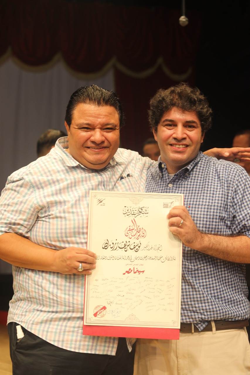 وتسلم أحمد نجل الناقد يوسف شريف رزق الله، شهادة تقدير والده من المخرج خالد جلال، مخرج العرض المسرحي "سينما مصر" الموقعة من كل أبطال العرض وتحمل عنوان "إلى من عاش ليبقى"، وذلك عقب انتهاء العرض، بحضور الفنان مجدي صبحي، والفنان خالد عبد السلام، والرسام الصحفي فيليب فكري.