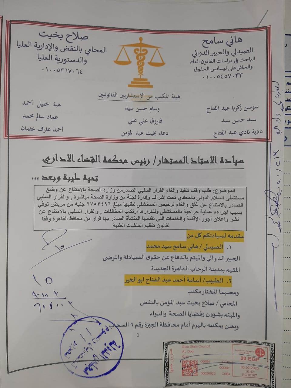 القضية رفعها الصيدلي هاني سامح والمحامي بالنقض صلاح بخيت ومعهما الطبيب أسامة ابو الخير، الذي توفي والده جراء عملية جراحية بالمستشفى الذي طالبه بسداد 2.75 مليون جنيه كأتعاب خدمات طبية للمستشفى.