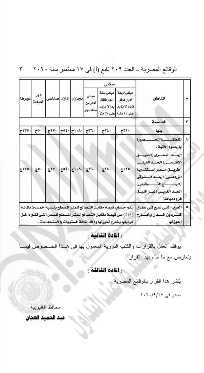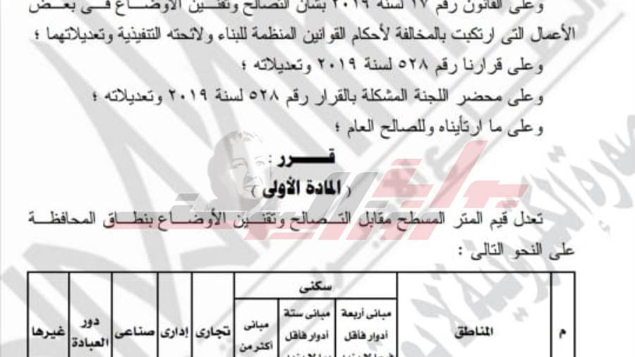 • التجاري اصبحت قيمة سعر المتر 720 جنيها والاداري بـ360 جنيها وصناعي 180 جنيها ودور العبادة بـ50 جنيها وغيرها بـ900 جنيه