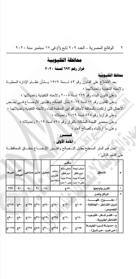 أصدر اللواء عبد الحميد الهجان، محافظ القليوبية، قرار رقم لسنة 2020 بشأن تخفيض أسعار التصالح، ليكون التخفيض ما بين 10-33% ويصل التخفيض إلى أكثر من 55% عند الدفع الفوري لتكون كالآتي: