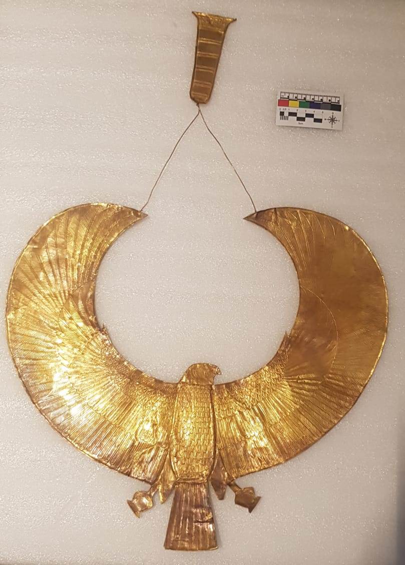 و أشار الدكتور الطيب عباس مدير عام الشؤون الأثرية بالمتحف المصري الكبير، أن تلك القطع تضم ٥٤ قطعة اثرية من مجموعة الملك توت عنخ امون تحتوي علي مجوعة من الحلي والقلائد الذهبية وكذلك تمثال من الخشب المذهب يصور الملك توت عنخ آمون على ظهر فهد. ويظهر الملك واقفا، وساقه اليسرى تتقدم يمناه على قاعدة مستطيلة الشكل مثبتة على ظهر الفهد، ويمسك الملك في إحدى يديه بعصا، وفي الأخرى يمسك بمذبة. ويرتدي الملك التاج الأبيض لمصر العليا، وعلى جبينه الصل المقدس وعقد عريض يغطى صدره وكتفيه وينتهي بصف من حبات الخرز.
