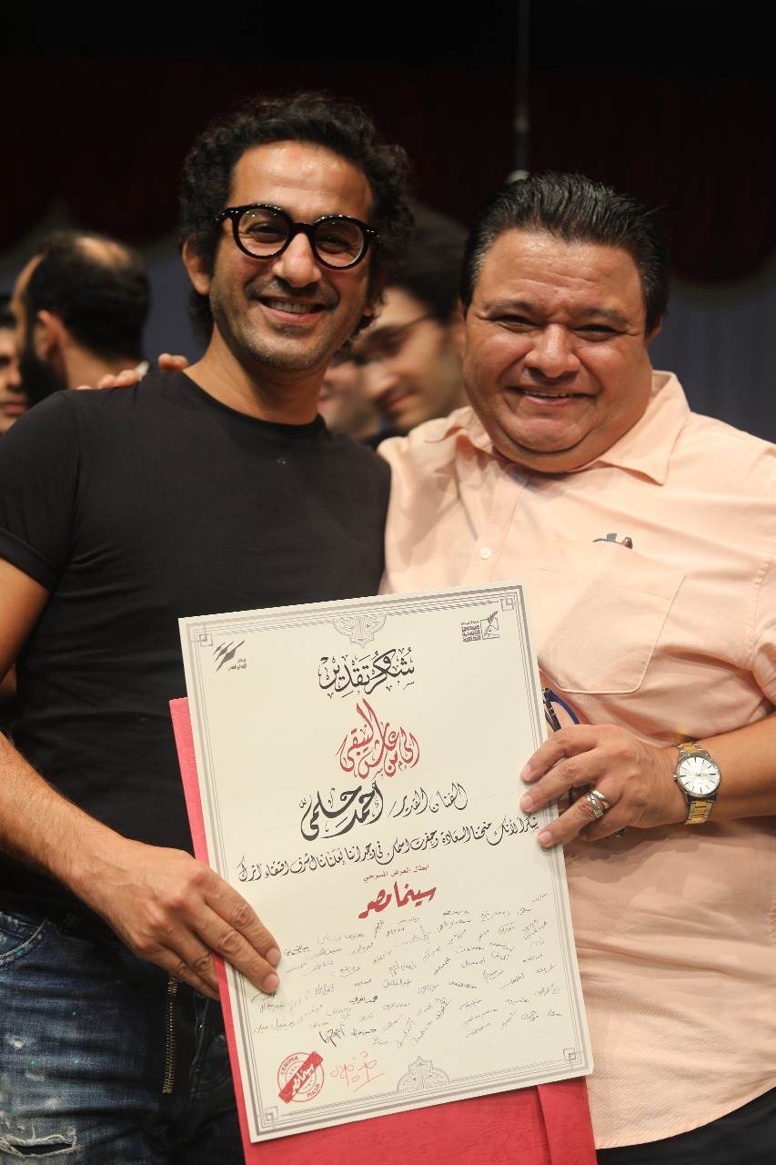 وأهدى خالد جلال، مخرج "سينما مصر" شهادة تقدير موقعة من كل أبطال العرض وتحمل عنوان "إلى من عاش ليبقى"، للفنان أحمد حلمي، عقب مشاهدته للعرض المسرحي "سينما مصر"، بحضور الإعلامي حازم شفيق رئيس قناة الحياة، ومهندس الديكور محمد الوكيل.