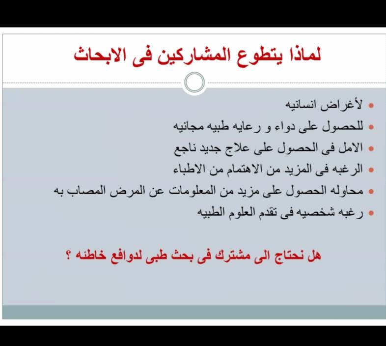 كما تم التعريف بمفهوم الموافقة المستنيرة على البحوث، والتي تنص القواعد الأخلاقية لإجراء البحوث علي أهميتها، حيث تعد آلية للحفاظ علي حقوق الأشخاص المشاركين فى البحث تنفيذا لمبدأ حق الاستقلالية والاختيار، ويتم عن طريقها التأكد من طواعية مشاركة المبحوث فى البحث، ويتم توثيق الموافقة المستنيرة عن طريق استمارة موافقة موقعة ومؤرخة، وهذه الموافقة لا تصلح بدون موافقة لجنة أخلاقيات البحث العلمى، كما ناقشت ورشة العمل كذلك التعرف على الدوافع لتطوع المشاركين في الأبحاث الطبية.