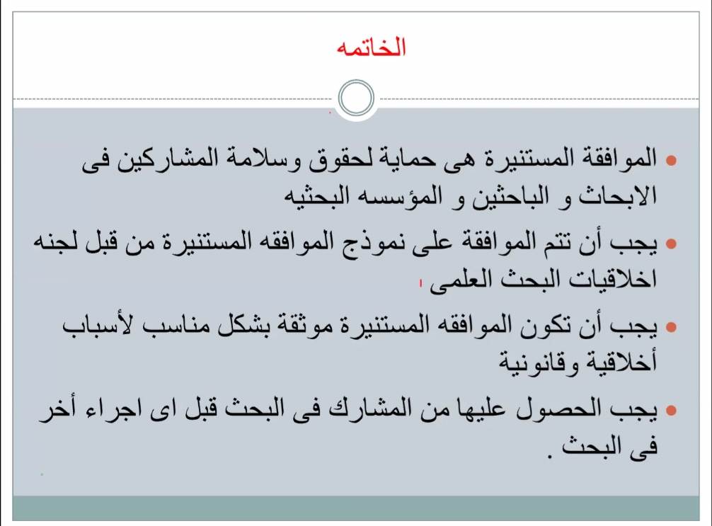 وأوضحت ورشة العمل شروط كتابة وثيقة الموافقة المستنيرة بطريقة صحيحة، حيث يجب تجنب المصطلحات العلمية المعقدة، وأن تحمل جمل بسيطة، وترجمة جيدة عندما تكون لغة البحث ليست اللغة الاساسية للمشاركين، ولابد من شرح كافي للمشارك، والإمضاء والتأريخ على الوثيقة، وهناك شروط إجبارية لابد من كتابتها فى الموافقة المستنيرة وهى توضيح بحث أو دراسة، وتوضيح الهدف من البحث، وإجراءات إجراء البحث، ووصف المخاطر من هذه التجربة، ووصف الفوائد، وشرح البدائل، ولابد من حفظ السرية، والتعريف بالتعويضات فى حالة حدوث أى مشكلة للمشارك، ولابد من وجود أرقام للإتصال والتواصل، وتوضيح طواعية الانضمام والانسحاب.