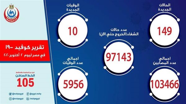وتم تسجيل 149 حالة جديدة ثبتت إيجابية تحاليلها معمليًا للفيروس، وذلك ضمن إجراءات الترصد والتقصي والفحوصات اللازمة التي تُجريها الوزارة وفقًا لإرشادات منظمة الصحة العالمية، ووفاة 10 حالات جديدة.
