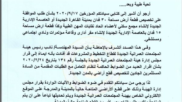 اتحاد المهن الطبية يشكل لجنة لمعاينة أراض بالعاصمة الإدارية والقاهرة الجديدة
