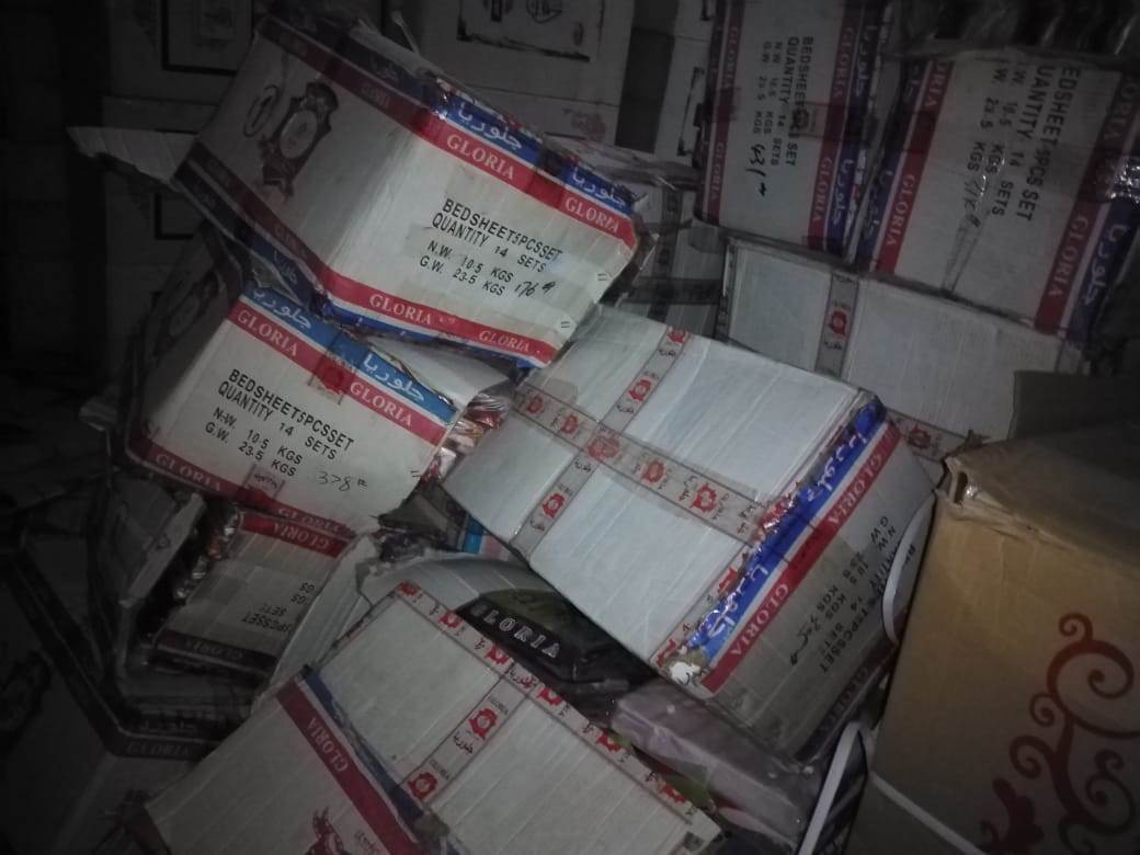 ضبط عدد 25 كرتونة بداخل الكرتونة 12 مفرش سرير غير مدون عليها أي بيانات