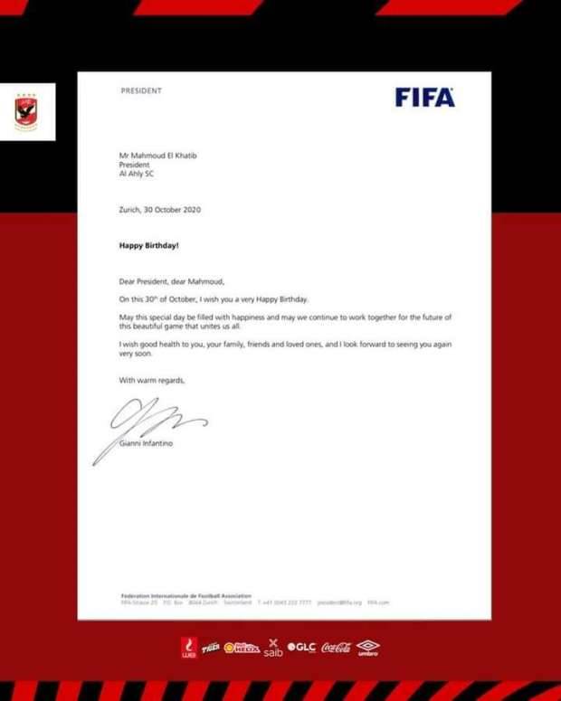 ونشر الحساب الرسمي للنادي الأهلي على مواقع التواصل الاجتماعي، رسالة إنفانتينو للخطيب مهنئًا إياه بعيد ميلاده والذي أحتفل به أمس الجمعة، متمنيًا له عيد ميلاد سعيد جدًا.