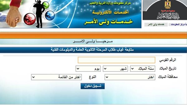"بوابة روزاليوسف"، تنشر كيفية متابعة أولياء الأمور لغياب أبنائهم، طلاب الثانوية العامة، والدبلومات الفنية، ويستطيع كل ولي أمر أن يتعرف من خلال موقع غياب الثانوية العامة على عدد الأيام، التي لم يحضرها ابنه في المدرسة، وذلك عن طريق، إدخال الرقم القومي عبر الموقع من خلال شبكة الإنترنت، وهو ما يعني سهولة متابعة أولياء الأمور لأبنائهم خلال العام الدراسي، ومعرفة عدد أيام الحضور والغياب.