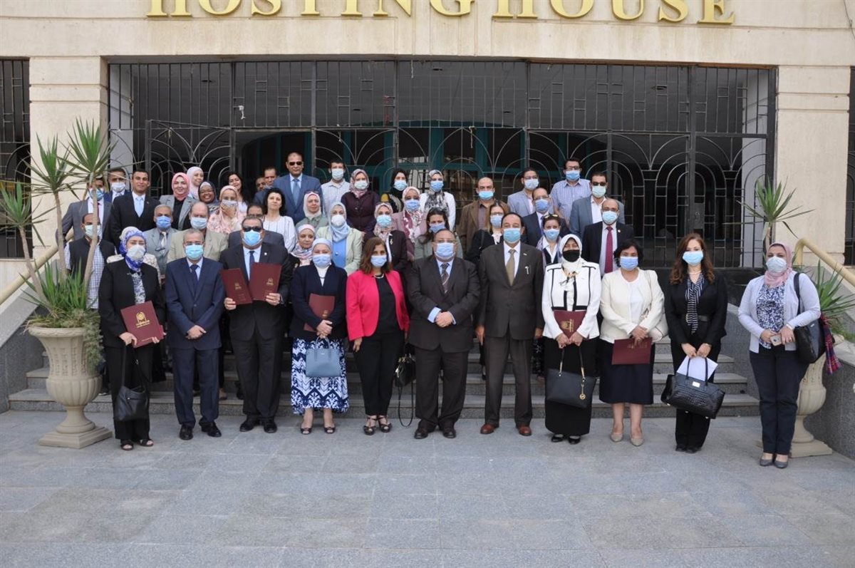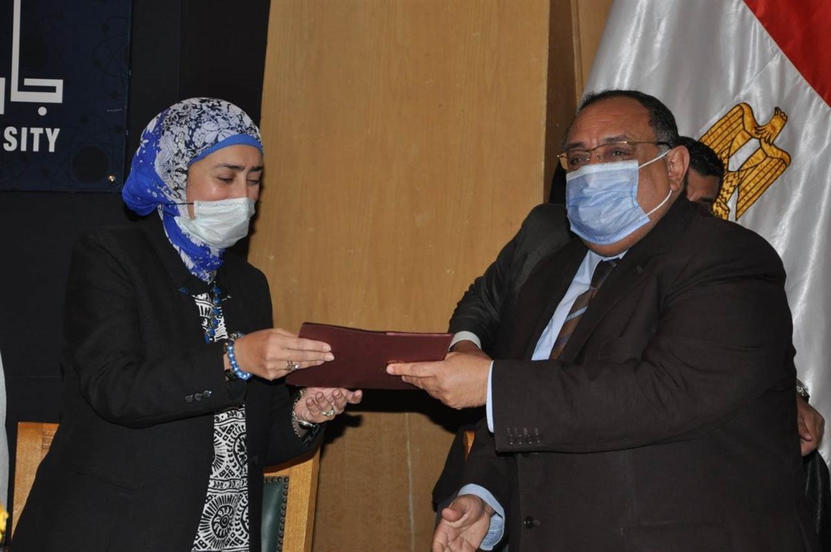انطلقت أمس فعاليات "حفل توقيع وتسليم عقود المشروعات البحثية الممولة من قبل صندوق البحث العلمي جامعة حلوان" تحت رعاية الدكتور ماجد نجم، رئيس الجامعة، والدكتورة منى فؤاد عطية، نائب رئيس الجامعة للدراسات العليا والبحوث، والذي تضمن توقيع وتسليم عقود تمويل ٦ مشروعات بحثية فائزة من كليات، الطب، والصيدلة، والفنون التطبيقية، والآداب، والحقوق، من إجمالي ١١ مشروعا مقدما، بحضور الدكتور محمد عبد الحميد النشار، وزير التعليم العالي الأسبق ورئيس جامعة حلوان الأسبق، وعمداء الكليات ووكلائها ورؤساء الكيانات البحثية بالجامعة ومسؤوليها.