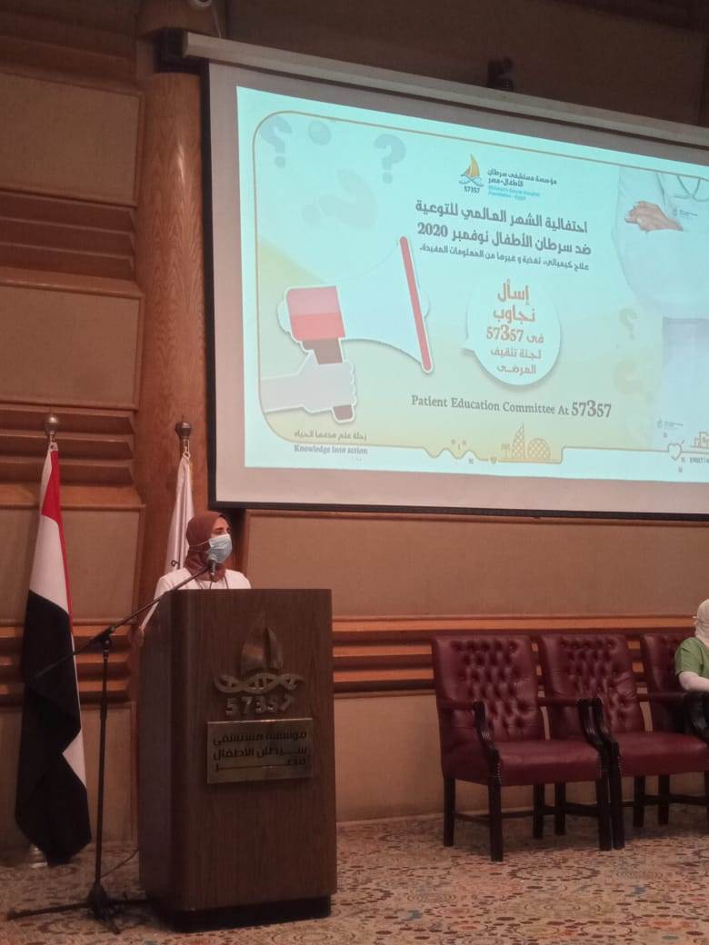 نظم مستشفى سرطان الأطفال مصر 57357، فعالية بعنوان "كيفية التعامل مع السرطان؟"، وخاصة العلاج الكيميائي، والتغذية، وعرض وتصويب المعلومات الخاطئة عن تغذية مرضى السرطان، والمنتشرة على وسائل التواصل الاجتماعي، وكيفية تشخيص الطفل مريض السرطان، وذلك بحضور عدد من فريق التوعية ولجنة تثقيف المرضى بالمستشفى، والمكون من الأطباء والصيادلة والتمريض.