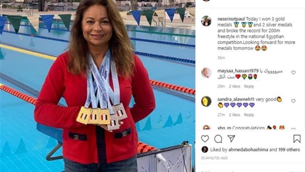 ونشرت والدة الفنانة عبر حسابها على Instagram صورة وهي تحمل ميدالياتها الخمس، وكتبت معلقة: "فزت اليوم بثلاث ميداليات ذهبية وميداليتين فضيتين، وحطمت الرقم القياسي لمسافة 200 متر حرة في المسابقة الوطنية المصرية للسباحة، وأتطلع لمزيد من الميداليات غدًا".