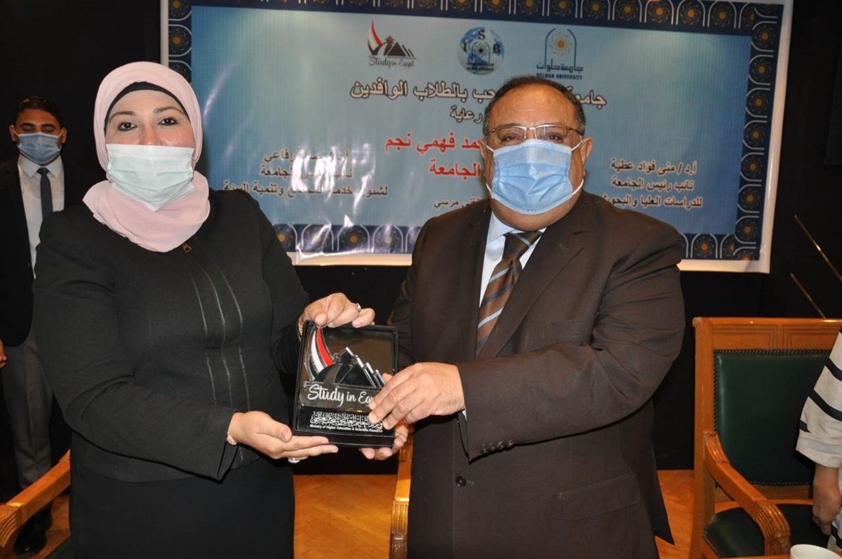 وأشارت الدكتورة منى فؤاد عطية، نائب رئيس الجامعة للدراسات العليا والبحوث، إلى خطة الجامعة لزيادة أعداد الوافدين وكذلك المنح الدراسية المقدمة لهم مع الحرص على التواصل معهم وتذليل الصعوبات التي تواجههم والمتابعة المستمرة للطالب منذ قيده بالجامعة حتى تخرجه، وكذلك الاهتمام بدمج الطلاب الوافدين مع أقرانهم المصريين من خلال الأنشطة والمسابقات والبرامج المختلفة، كما أعلنت عن حزمة من الإجراءات التحفيزية للعاملين بإدارة الوافدين.