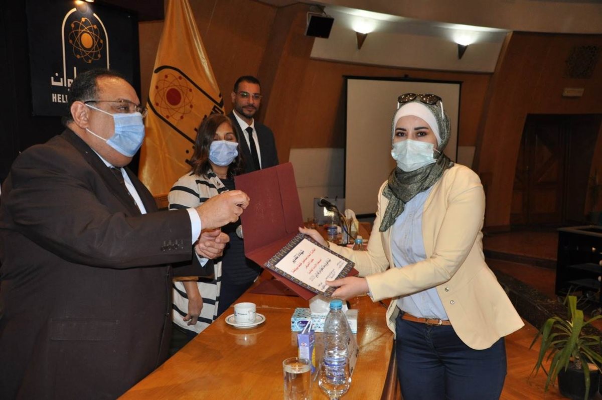 وقد أهدى الاستاذ الدكتور ماجد نجم درع الجامعة للدكتورة رشا كمال رئيس الإدارة المركزية للوافدين بوزارة التعليم العالي والبحث العلمي تقديرا لجهودها، كما أهدت الدكتورة رشا كمال الدكتور ماجد نجم رئيس جامعة حلوان درع مبادرة "ادرس في مصر".