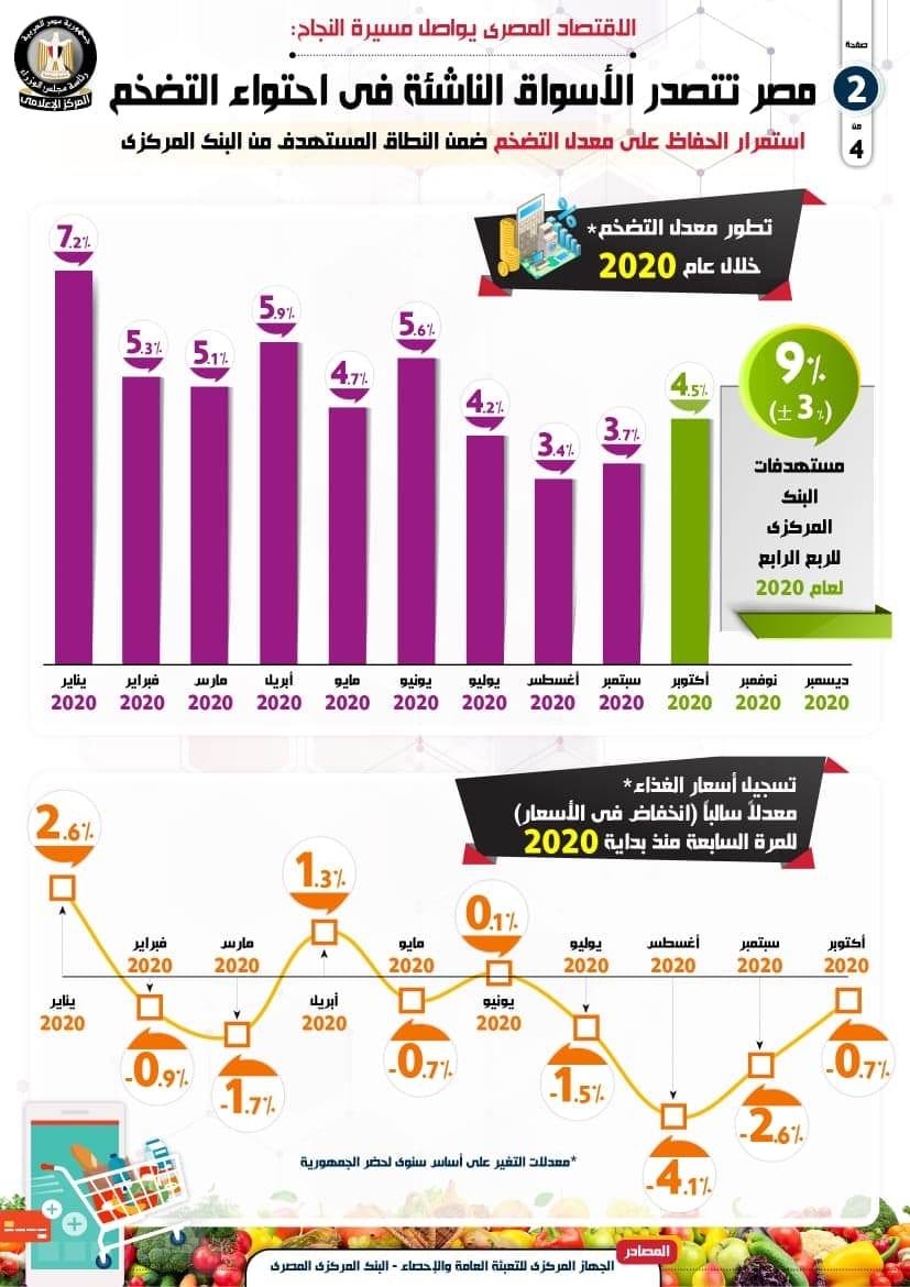 و أشار التقرير إلى استمرار الحفاظ على معدل التضخم ضمن النطاق المستهدف من البنك المركزي المصري 9% (± 3%)، مستعرضاً تطور معدلاته خلال عام 2020، حيث سجل 4.5% في أكتوبر، مقارنة بـ 3.7% في سبتمبر، و3.4% في أغسطس، و4.2% في يوليو، و5.6% في يونيو، و4.7% في مايو، و5.9% في أبريل، و5.1% في مارس، و5.3% في فبراير، و7.2% في يناير.
