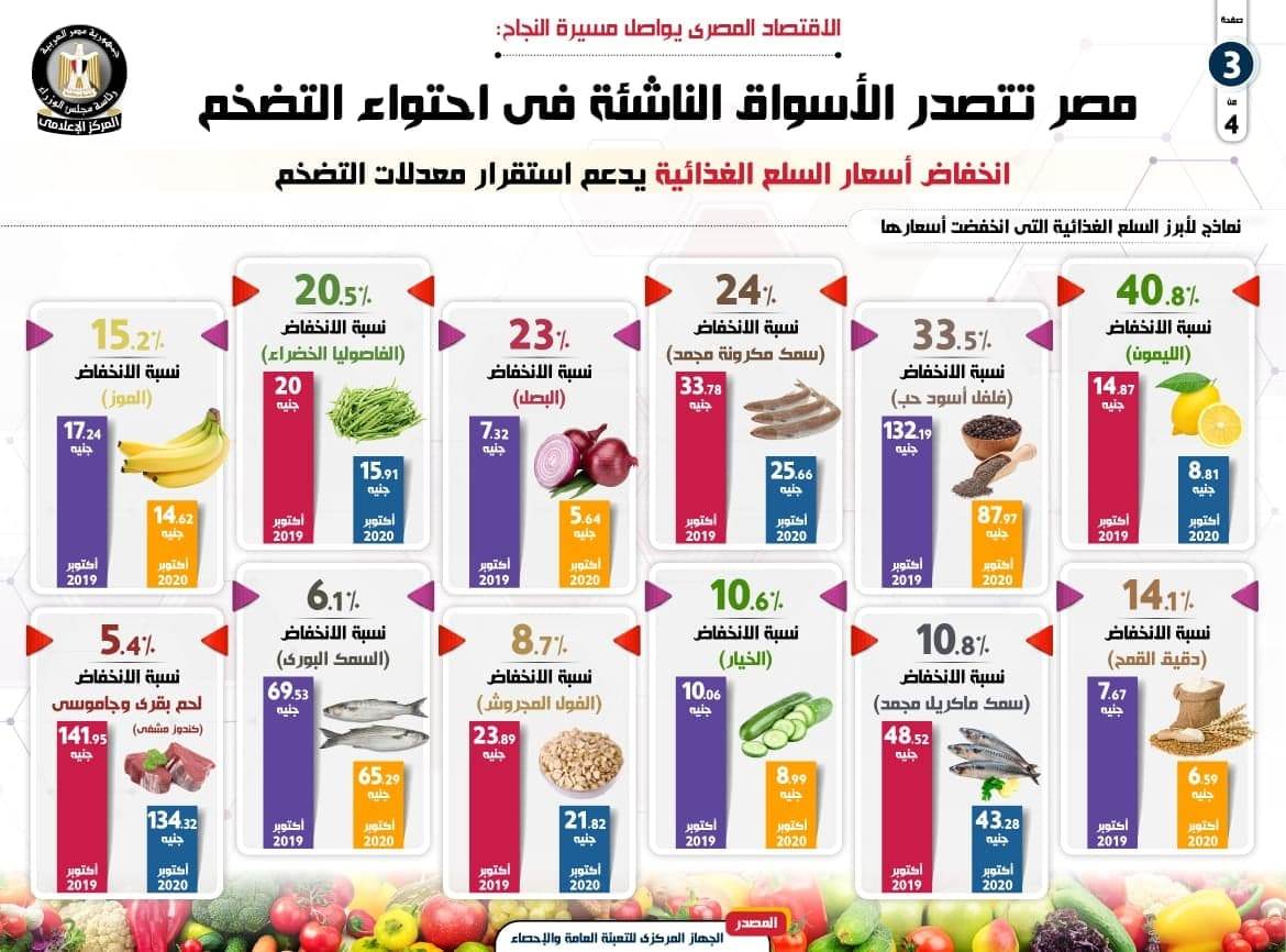 ورصد التقرير، نماذج لأبرز السلع الغذائية التي شهدت أسعارها انخفاضاً خلال أكتوبر 2020 مقارنة بنفس الشهر من العام السابق، حيث انخفض سعر الليمون بنسبة 40.8%، ليصل إلى 8.81 جنيه في أكتوبر 2020، مقارنة بـ 14.87 جنيه في أكتوبر 2019، كما انخفض سعر الفلفل الأسود الحب بنسبة 33.5%، ليصل إلى 87.97 جنيه في أكتوبر 2020، مقارنة بـ 132.19 جنيه في أكتوبر 2019، في حين انخفض سعر سمك المكرونة المجمد بنسبة 24%، ليصل إلى 25.66 جنيه في أكتوبر 2020، مقارنة بـ 33.78 جنيه في أكتوبر 2019.