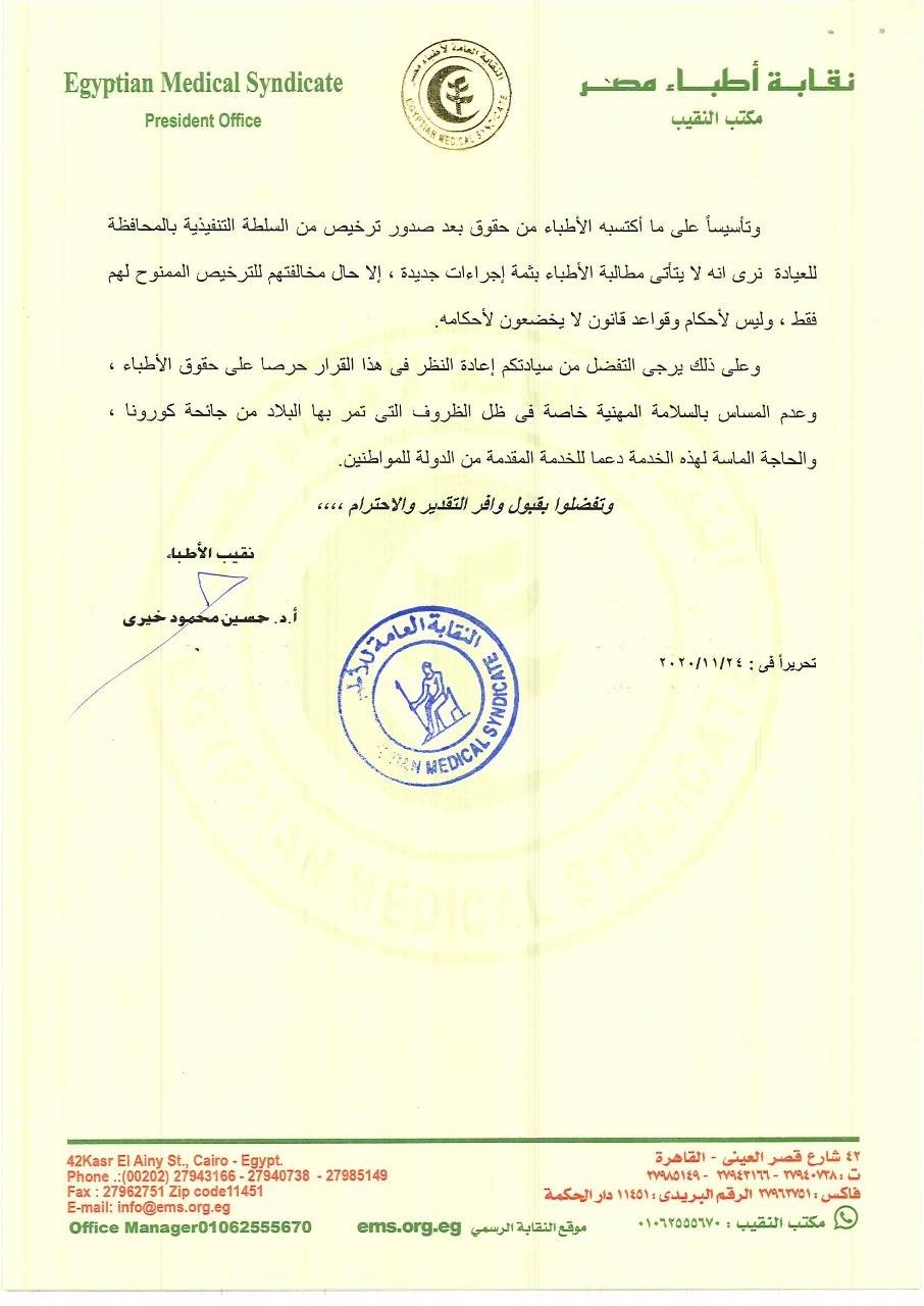 وجاء نص الخطاب، المرسل على لسان د. حسين خيري، نقيب الأطباء، كالتالى: