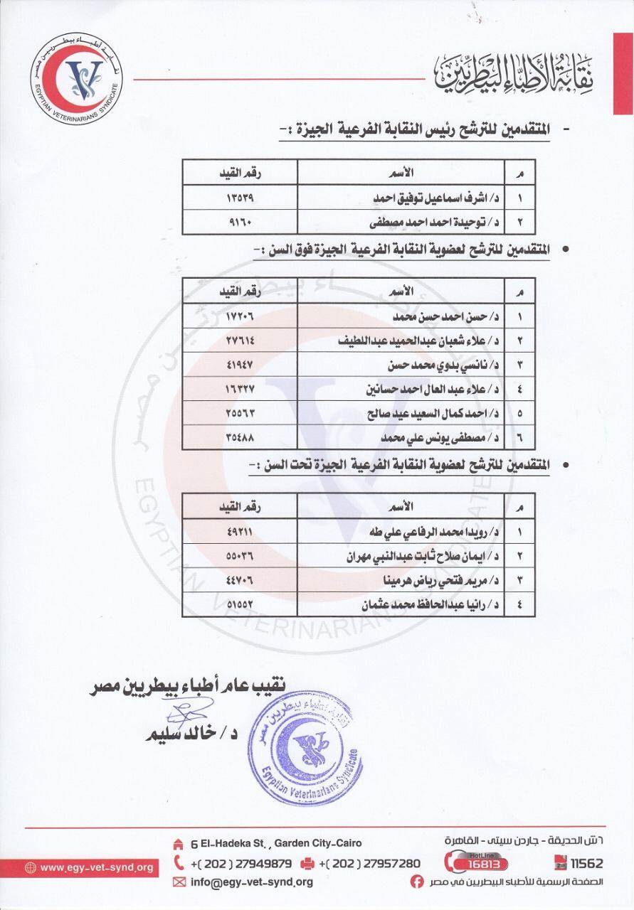 أعلنت النقابة العامة للأطباء البيطريين، برئاسة الدكتور خالد سليم، النقيب العام، الكشوف الأولية لأسماء الأطباء المرشحين لانتخابات نقابتي القاهرة والجيزة الفرعيتين لعام 2020 – 2021.